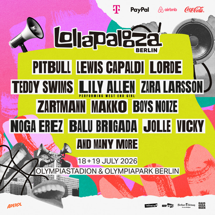 O Lollapalooza Berlin confirmou os primeiros grandes artistas internacionais de sua edição de 2026, que acontece nos dias 18 e 19 de julho, no icônico Parque Olímpico de Berlim. Entre os nomes anunciados estão Pitbull, Lewis Capaldi, Lorde, Teddy Swims, Lily Allen, Zara Larsson e o alemão Zartmann, reforçando o caráter global e diverso do festival.